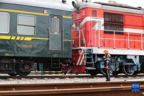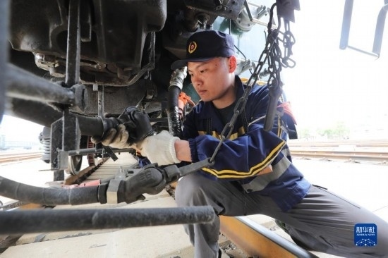 4月28日,中國(guó)鐵路上海局集團(tuán)有限公司徐州站的鐵路連結(jié)員在進(jìn)行單機(jī)連掛車(chē)輛作業(yè)。