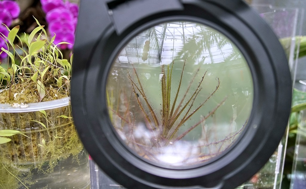 這是4月27日在國家植物園溫室內(nèi)透過放大鏡拍攝的美杜莎捕蟲樹。新華社記者 李欣 攝