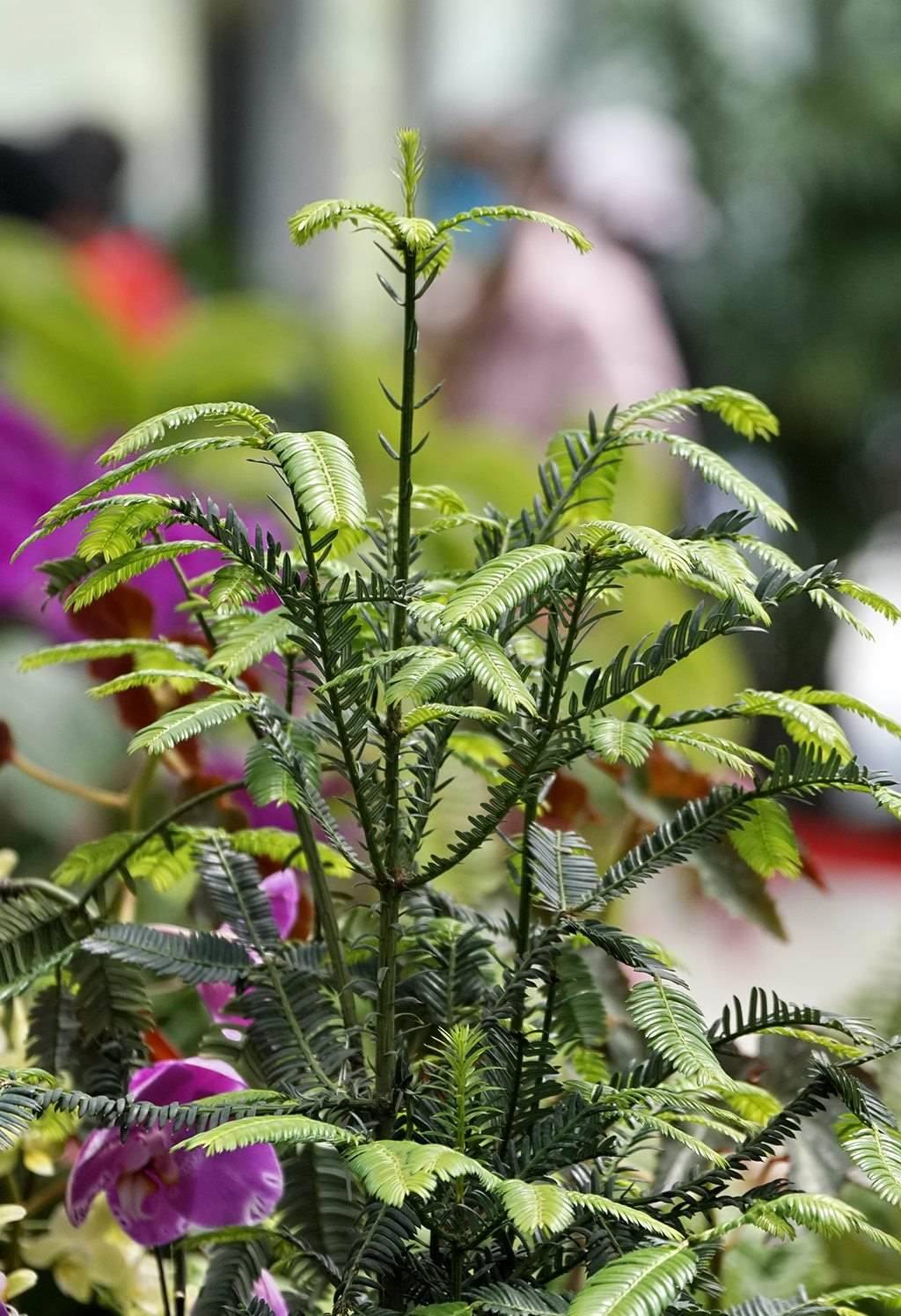 這是4月27日在國家植物園溫室內(nèi)拍攝的蓖子三尖杉。新華社記者 李欣 攝