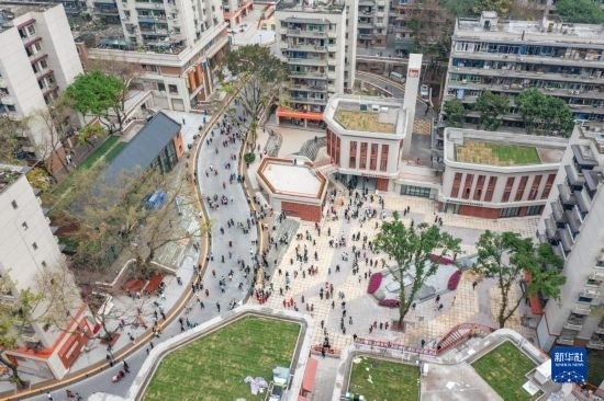4月28日,重慶市九龍坡區(qū)謝家灣街道民主村片區(qū)城市更新項(xiàng)目(一期)正式竣工亮相,市民游客前來打卡。