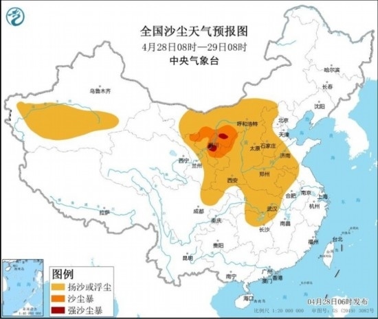 受冷空氣大風(fēng)影響,預(yù)計(jì)4月28日08時(shí)至29日08時(shí),新疆南部、內(nèi)蒙古中西部、甘肅北部和東部、寧夏、陜西、四川盆地北部、山西、河北西部、河南、山東中西部、湖北、湖南北部、安徽北部、江蘇西北部等地的部分地區(qū)有揚(yáng)沙或浮塵天氣,其中,內(nèi)蒙古西南部、甘肅東北部、寧夏中北部、陜西西北部等地的部分地區(qū)有沙塵暴,局地有強(qiáng)沙塵暴。中央氣象臺(tái)4月28日06時(shí)發(fā)布沙塵暴藍(lán)色預(yù)警。