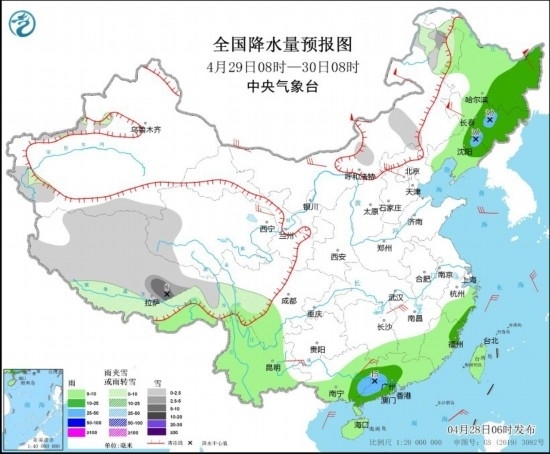 4月29日08時(shí)至30日08時(shí),內(nèi)蒙古東北部、新疆南疆盆地西部、西藏大部、青海西部、川西高原南部等地部分地區(qū)有小雪或雨夾雪,其中,西藏東南部等地部分地區(qū)有中到大雪(5~8毫米)。東北地區(qū)大部、江南東部和南部、華南大部、臺(tái)灣島等地部分地區(qū)有小到中雨,其中,吉林東部、遼寧北部、廣西東部、廣東中西部等地部分地區(qū)有大雨(25~45毫米)。內(nèi)蒙古中北部、黑龍江東北部、青海東部、江西北部、貴州西南部、廣西東北部等地部分地區(qū)有4~6級風(fēng)。