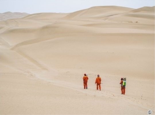 圖⑤東方地球物理公司新疆塔里木物探處的工人馮永生(前)、馮雙生(中)、馮志鵬在沙漠中進行測量定位,標記鉆井點。新華社發(fā)