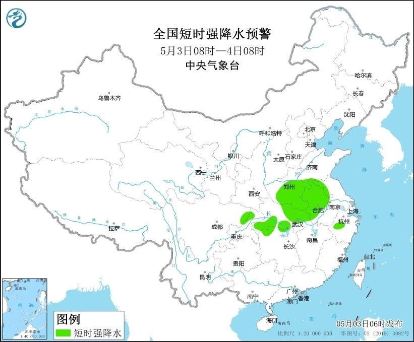 預計5月3日08時至4日08時,河南東部和南部、安徽中北部、湖北東部等地的部分地區(qū)將有8-10級雷暴大風或冰雹天氣;山東南部、河南中東部和南部、安徽中北部、江蘇西北部、湖北東部和西南部、湖南北部、四川東北部、重慶東北部等地的部分地區(qū)將有短時強降水天氣,小時雨量20-40毫米,局地可達50毫米以上。