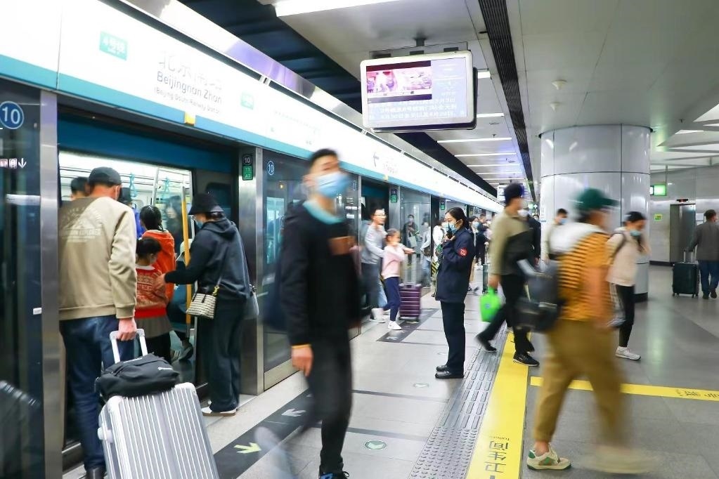 “大家進(jìn)站時(shí)要小心腳下的行李箱?!?日14時(shí),隨著大量鐵路旅客抵達(dá)北京南站,地鐵4號(hào)線北京南站也開始變得忙碌。站廳內(nèi),工作人員在自動(dòng)售票機(jī)、閘機(jī)前引導(dǎo)旅客快速購(gòu)票進(jìn)站;站臺(tái)上,軌道列車準(zhǔn)時(shí)抵達(dá),乘客快速流動(dòng)疏散。