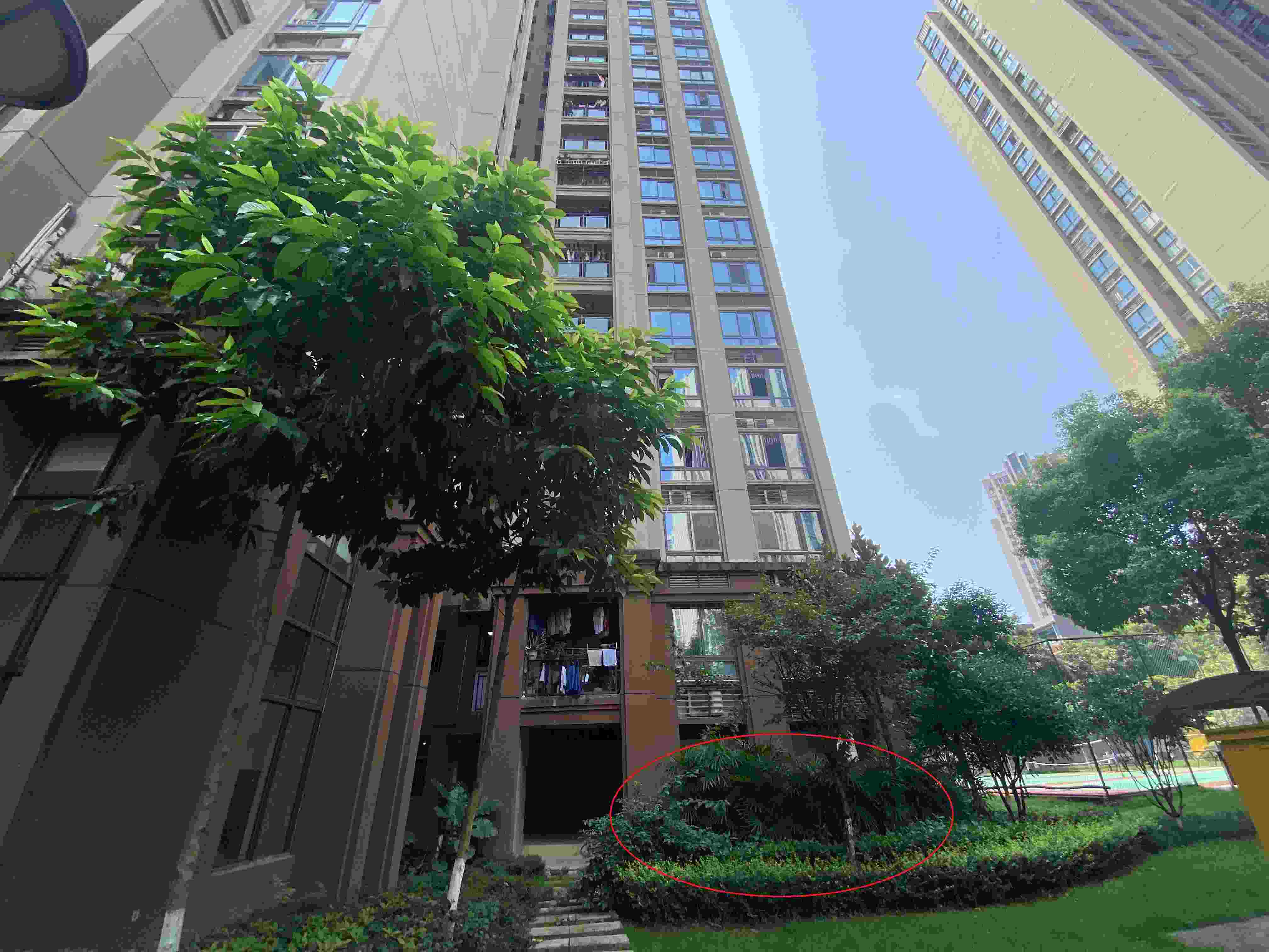 2020年11月2日,2名幼童從重慶南岸區(qū)錦江華府4棟15樓墜下(紅圈處),檢方指控孩子父親涉嫌故意殺人。 澎湃新聞?dòng)浾?謝寅宗 資料圖