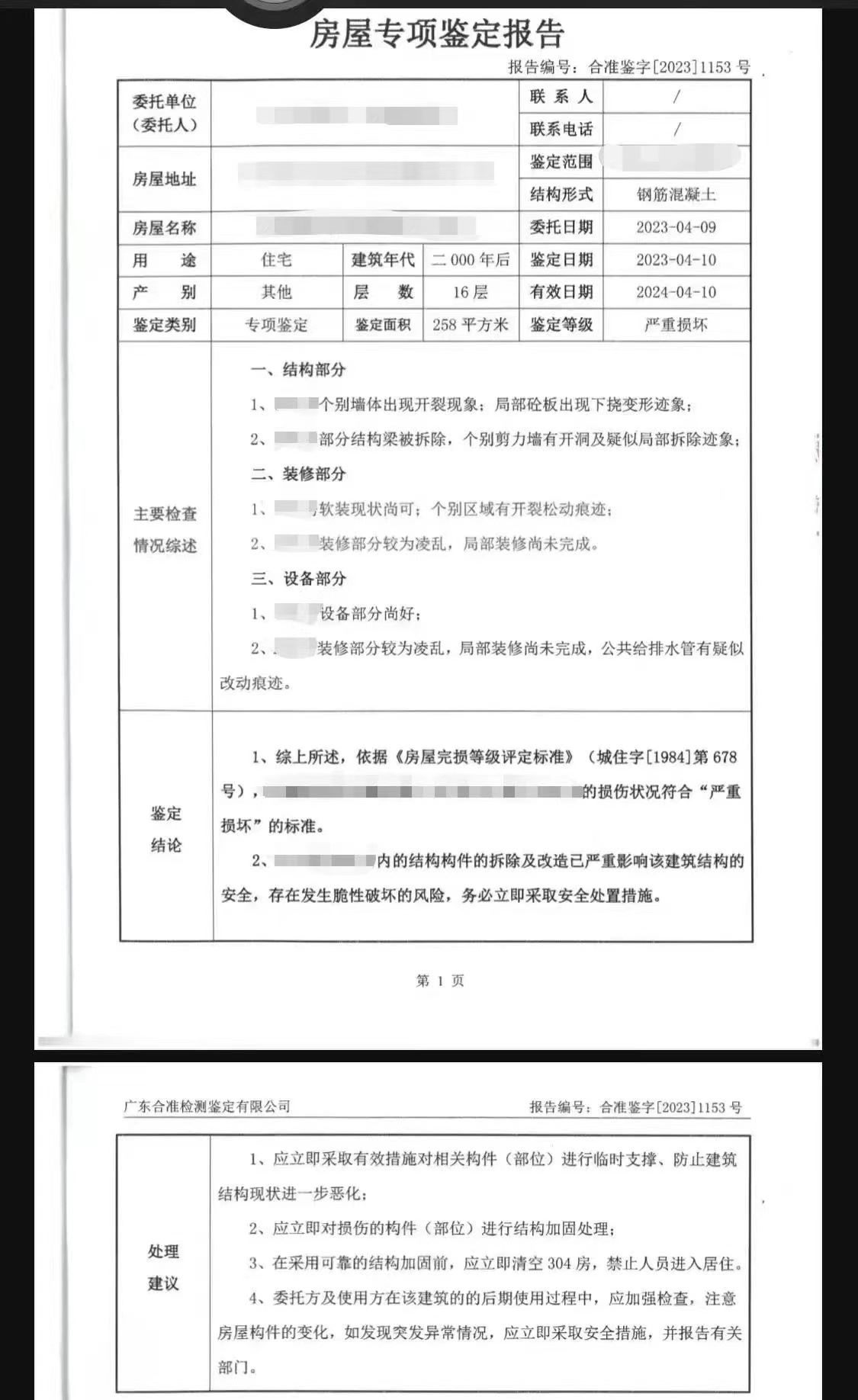 值得注意的是,發(fā)現(xiàn)204房的承重墻被拆后,有業(yè)主曾自費請鑒定機構(gòu)對204房、304房進行安全鑒定。鑒定結(jié)果顯示,涉事房屋的損傷程度符合“嚴重損壞”的標準;在采用可靠的結(jié)構(gòu)加固前,應立即清空304房,禁止人員進入居住。而在5月5日,永平街道辦在涉事樓棟貼出“致廣大居民朋友的一封信”,其中提到:4月8日至18日,已經(jīng)完成了臨時加固支撐工程,目前建筑物整體結(jié)構(gòu)穩(wěn)定可控,人員無需轉(zhuǎn)移,但需要盡快加固補強。