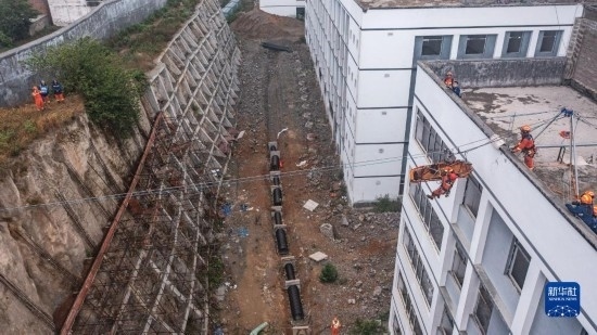消防救援人員在進(jìn)行模擬山體垮塌救援演練(5月11日攝,無人機(jī)照片)。