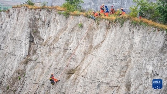 銅仁消防救援支隊(duì)隊(duì)員在進(jìn)行速降(5月11日攝)。