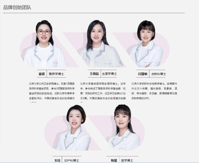 “五個(gè)女博士”官網(wǎng)信息則宣傳,該品牌成立于2019年7月,由來(lái)自北京大學(xué)的五個(gè)醫(yī)學(xué)女博士聯(lián)合創(chuàng)立,官網(wǎng)首頁(yè)還放上了五人的簡(jiǎn)介。其主要產(chǎn)品包括膠原蛋白肽維c飲品、每日亢唐植物飲品等。