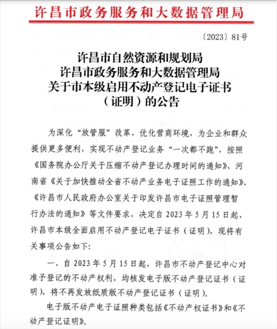 ·河南許昌:全面啟用不動產(chǎn)登記電子證書,不再發(fā)放紙質(zhì)版證書。