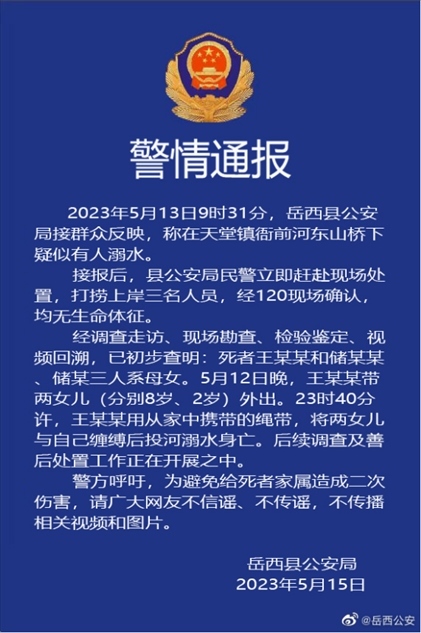 ·安慶警方通報母女三人溺亡:女子將兩女兒與自己纏縛后投河。