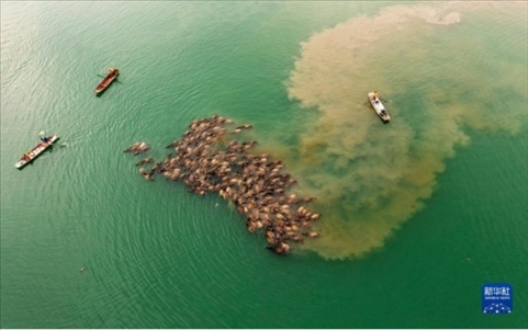 5月13日,在南充市蓬安縣相如鎮(zhèn)油房溝村嘉陵江段,成群結(jié)隊的水牛渡江。