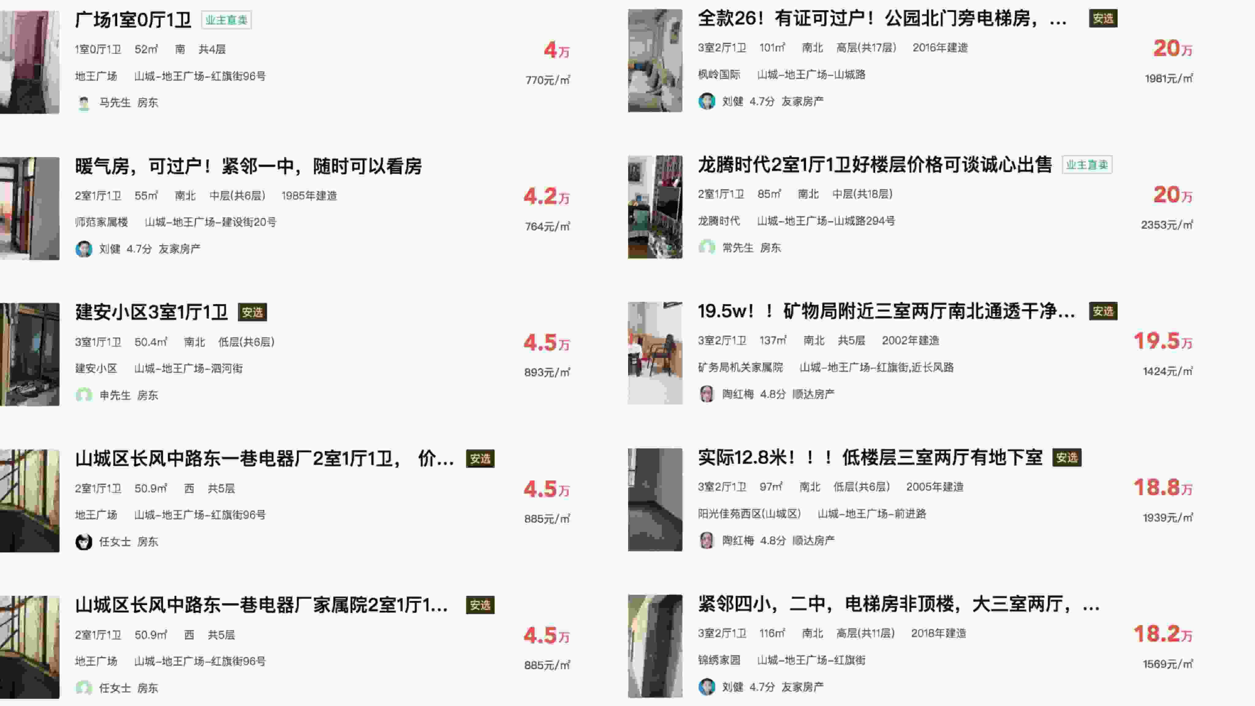 澎湃新聞從安居客平臺(tái)看到,鶴壁市低總價(jià)的房源確實(shí)存在,價(jià)格約在4萬元/套,且多集中于鶴壁市山城區(qū)。