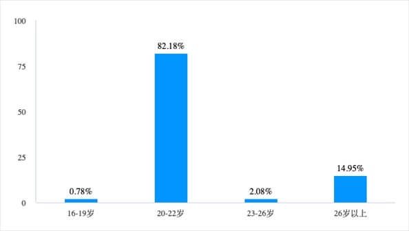 同樣,由于需要一天內(nèi)打卡多個(gè)甚至十幾個(gè)景點(diǎn)、為了節(jié)省成本而大量采取步行和騎行的“特種兵旅游”需要大量體力,因此集中在年輕人群,調(diào)查結(jié)果顯示有82.18%受訪者年齡段集中在20~22歲,可見大學(xué)生人群是對(duì)“特種兵旅游”感興趣和參與的主力。