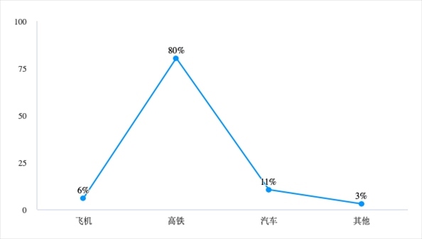正因大部分受訪者選擇的都是周邊短途游,所以高鐵成為了最為便捷和價(jià)格適宜的交通工具,有80%的受訪者選擇的出行工具是高鐵。