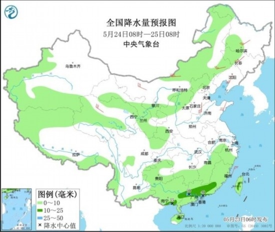 全國降水量預(yù)報圖(5月24日08時-25日08時)