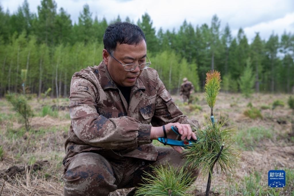 這是5月24日拍攝的伊春森工集團上甘嶺林業(yè)局公司溪水林場內(nèi)栽種的紅松樹苗。