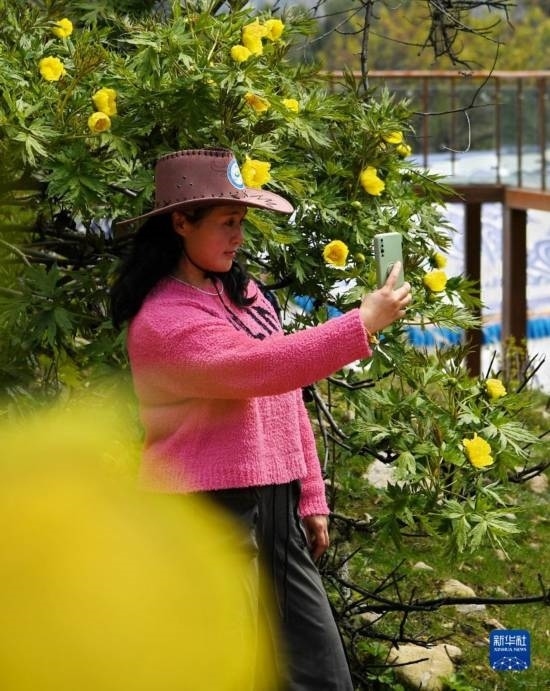 5月28日,一名游客在米林市南伊珞巴民族鄉(xiāng)扎貢溝野生大花黃牡丹前自拍。
