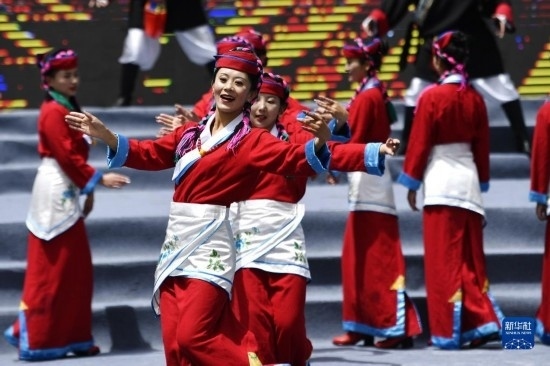 5月28日,演員在米林市第十五屆黃牡丹藏醫(yī)藥文化旅游節(jié)開(kāi)幕式上表演節(jié)目。