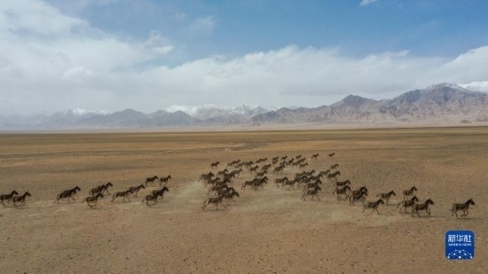 一群藏野驢在阿爾金山國(guó)家級(jí)自然保護(hù)區(qū)奔跑(5月23日攝,無(wú)人機(jī)照片)。