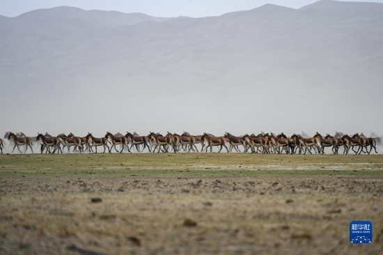 一群藏野驢在阿爾金山國(guó)家級(jí)自然保護(hù)區(qū)奔跑(5月23日攝)。
