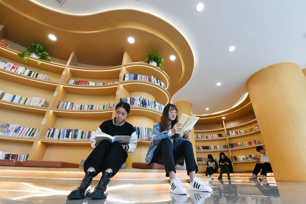 市民在江蘇省張家港市沙洲湖益空間·源書房?jī)?nèi)閱讀(2023年4月21日攝)。新華社記者 李博 攝