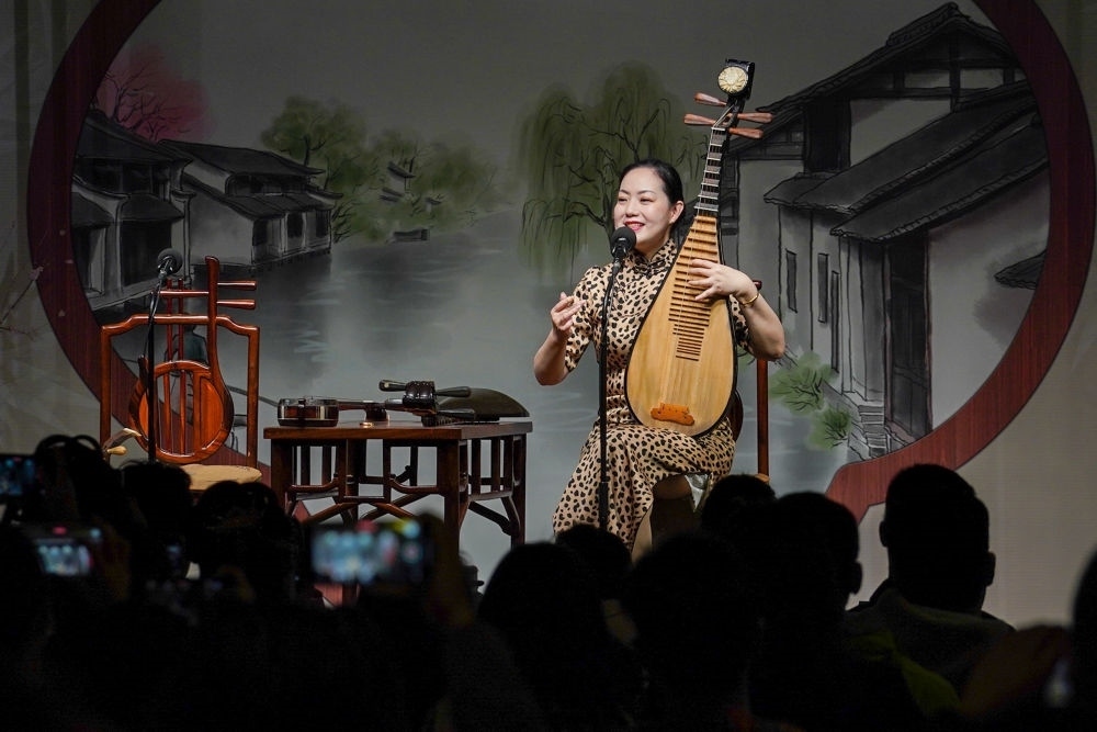評(píng)彈演員吳亮瑩在蘇州市姑蘇區(qū)一處評(píng)彈茶館演唱蘇州評(píng)彈版《聲聲慢》(2023年4月5日攝)。新華社記者 李博 攝