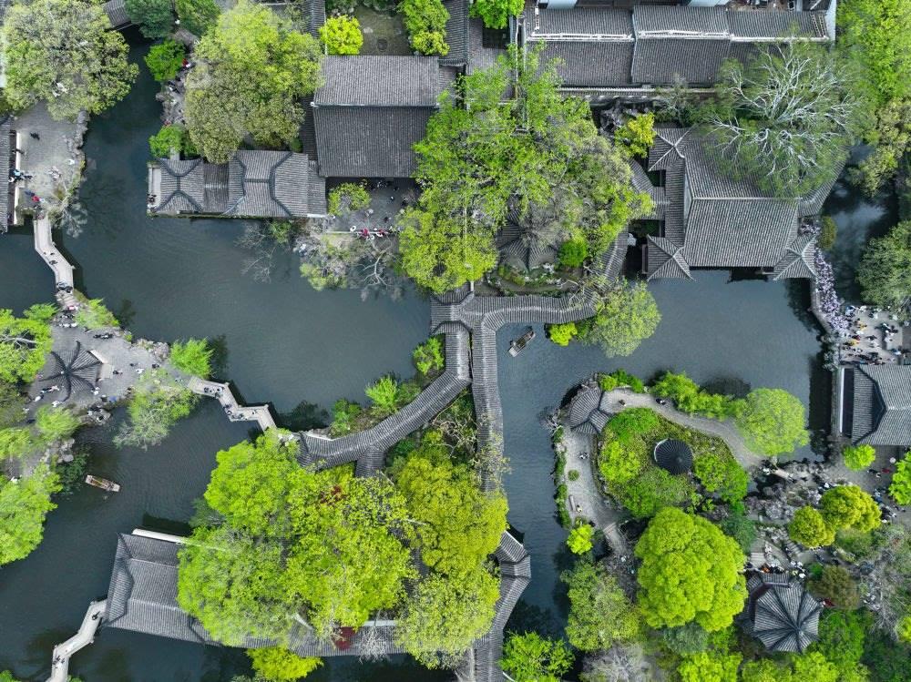 這是2023年4月5日拍攝的江蘇蘇州拙政園一景(無人機(jī)照片)。新華社記者 李博 攝