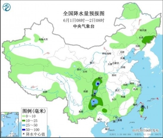 全國(guó)降水量預(yù)報(bào)圖(5月30日08時(shí)-31日08時(shí))