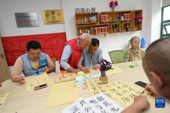5月29日,在湖州市環(huán)渚街道玉堂橋社區(qū),凌法林(左二)指導(dǎo)殘障人士練習(xí)書法。