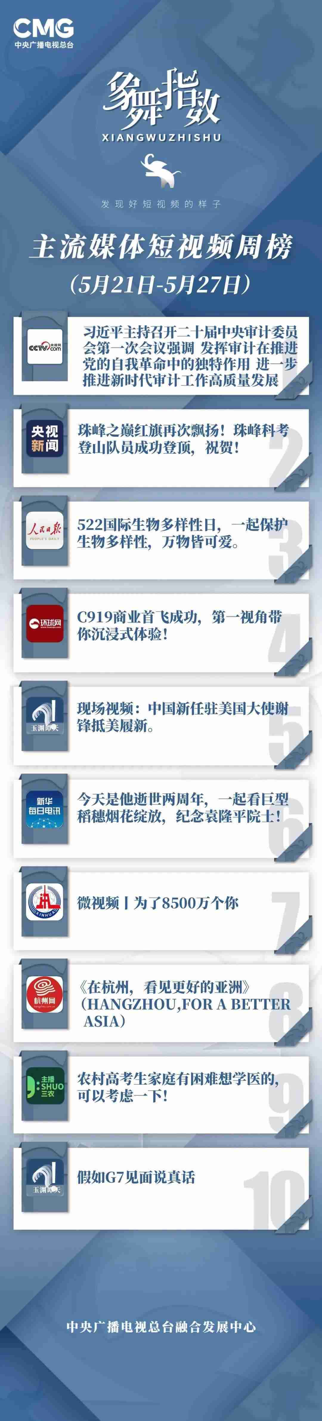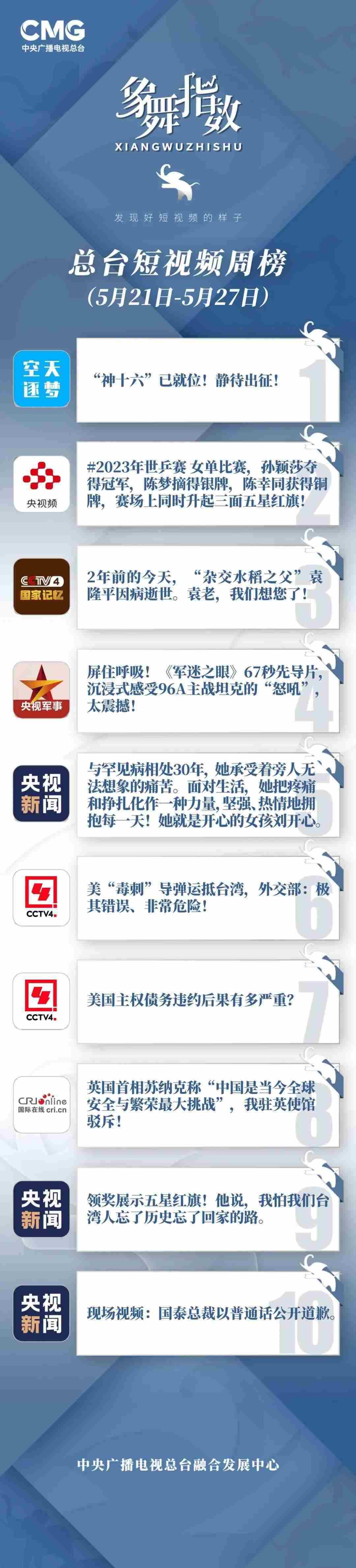 中央廣播電視總臺“象舞指數(shù)”評議品牌,推出主流媒體短視頻周榜、總臺短視頻周榜。在2023年5月21日—5月27日,這些內(nèi)容引發(fā)大眾關(guān)注: