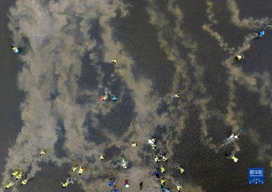 5月30日,在淮安市洪澤區(qū)岔河鎮(zhèn),人們在插秧節(jié)上參加摸魚比賽(無人機(jī)照片)。