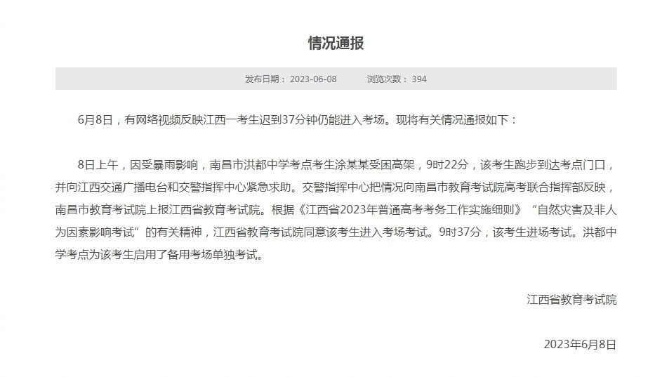 ·江西省教育考試院通報(bào)“一考生遲到37分鐘仍能進(jìn)入考場(chǎng)”。