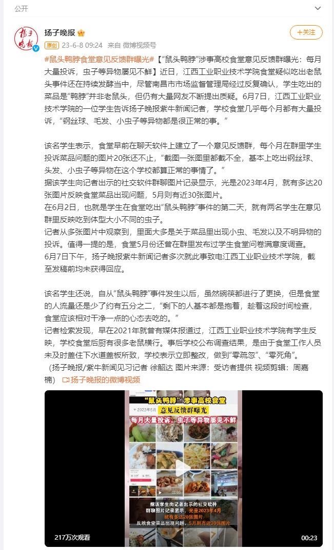 ·“鼠頭鴨脖”涉事高校食堂意見(jiàn)反饋群曝光:每月大量投訴,鋼絲球、毛發(fā)、蟲(chóng)子等異物屢見(jiàn)不鮮。