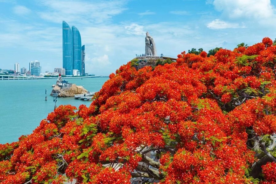 廈門(mén)鼓浪嶼上鳳凰花盛開(kāi),灼熱的陽(yáng)光灑向鳳凰木枝頭,光影斑駁,滿(mǎn)眼盡是艷麗的橙紅色,映照出夏日的動(dòng)人景致。