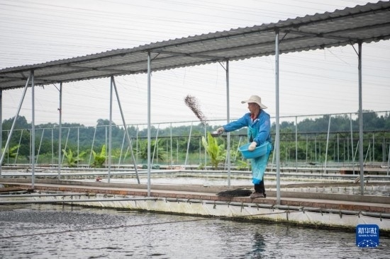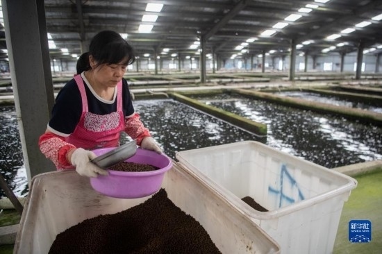 6月7日,中國清江(宜都)鱘魚谷工作人員在給鱘魚投喂餌料。