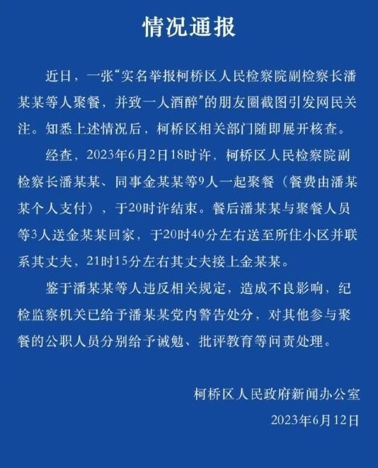 ·紹興一男子舉報妻子被上司帶去酒局遭灌酒,官方回應(yīng):給予處分。