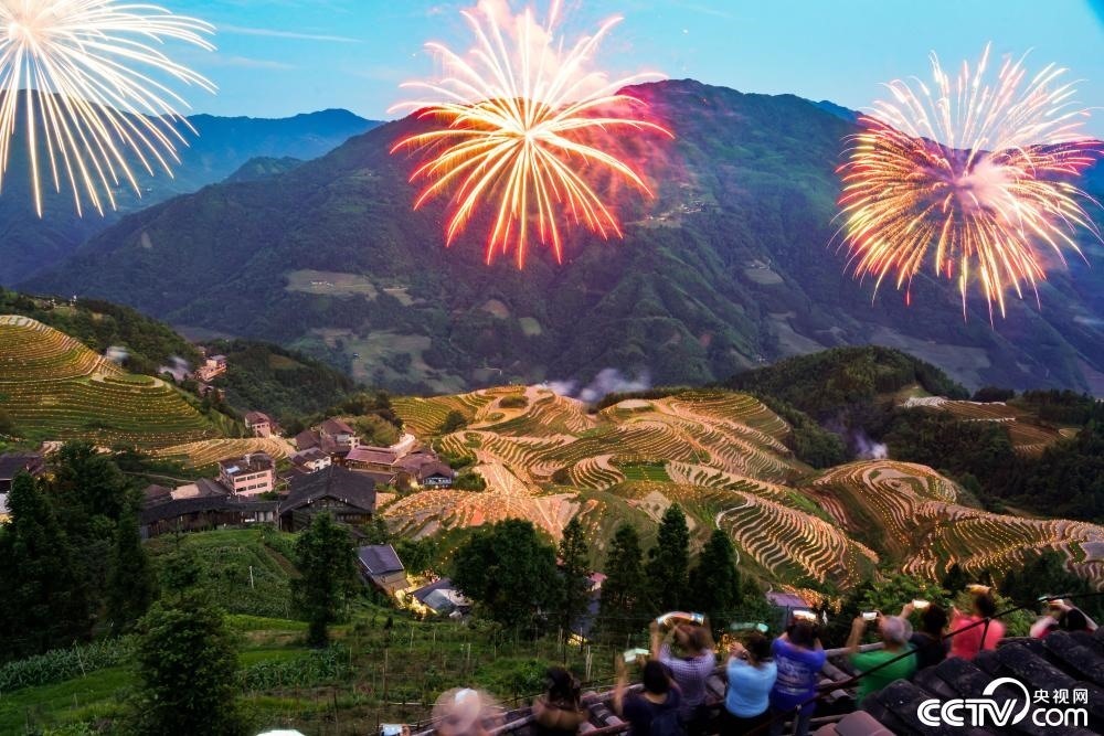 2023年6月10日,廣西桂林,龍勝龍脊梯田景區(qū)舉行一年一度的梳秧節(jié)。夜幕降臨,景區(qū)內(nèi)層層疊疊的梯田里星星點點的火把漸漸亮起,絢麗煙花在空中綻放,景色如畫。