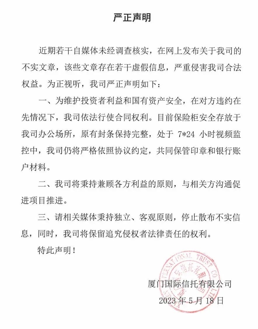 5月18日,廈門信托在官網(wǎng)和官方微信公眾號發(fā)布嚴正聲明稱,為維護投資者利益和國有資產(chǎn)安全,在對方違約在先情況下,我司依法行使合同權(quán)利。目前保險柜安全存放于我司辦公場所,原有封條保持完整,處于7*24小時視頻監(jiān)控中,我司仍將嚴格依照協(xié)議約定,共同保管印章和銀行賬戶材料。此外,我司將秉持兼顧各方利益的原則,與相關方溝通促進項目推進。