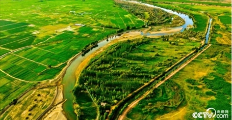 2023年6月15日,甘肅省張掖市,甘州區(qū)靖安鄉(xiāng)、臨澤縣板橋鎮(zhèn)境內(nèi)的黑河兩岸,寬闊的河床、彎曲的河流、農(nóng)作物以及樹木、蘆葦、濕地在夕陽(yáng)的映照下綠意盎然。