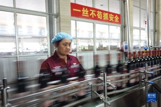 6月21日,在河北省懷來縣長城葡萄酒廠,一名工人在葡萄酒生產(chǎn)線上監(jiān)控生產(chǎn)情況。