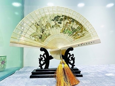 鄭士儒牙雕平刻作品《春夜宴桃李園圖》扇子。本報(bào)記者 張翼攝