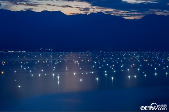 2023年9月9日,云南大理,夜幕降臨,漁燈鋪滿洱海,如星光點亮湖面。