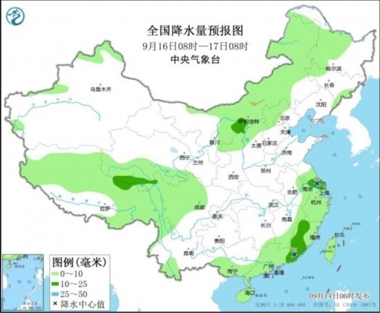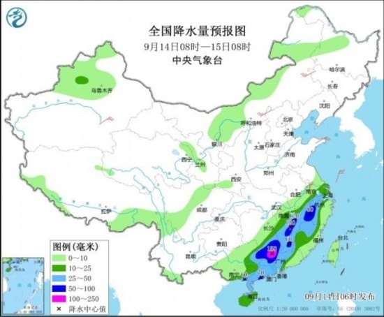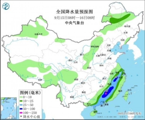 全國降水量預(yù)報(bào)圖(9月14日08時(shí)-15日08時(shí))