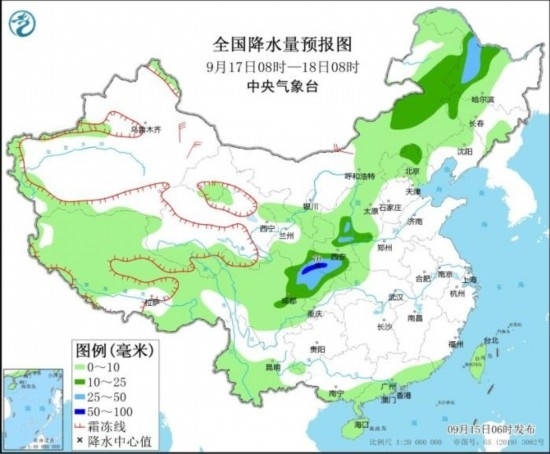 全國降水量預(yù)報圖(9月17日08時-18日08時)
