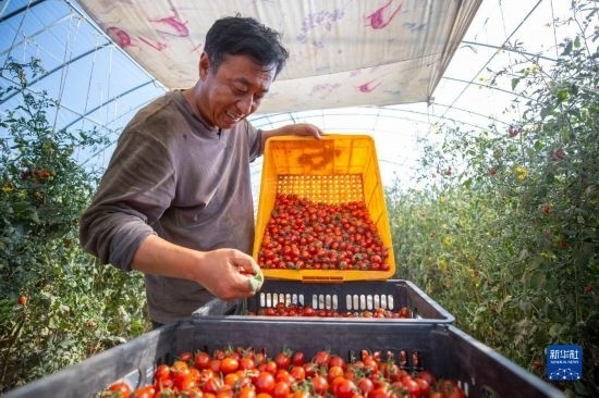 在吳忠市同心縣下馬關鎮(zhèn)的小番茄溫棚內,農民在分揀小番茄(9月14日攝)。