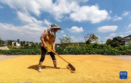 9月15日,村民在貴州省黔西市錦星鎮(zhèn)洪湖村晾曬稻谷。