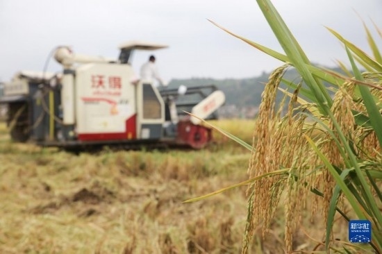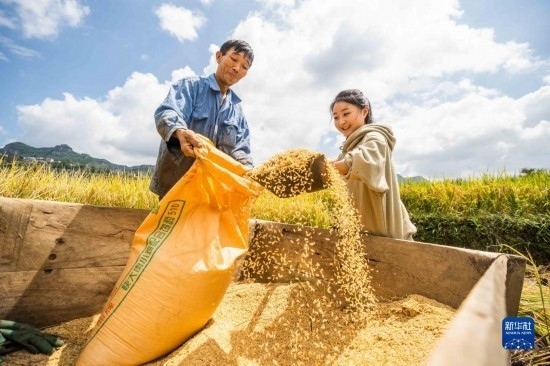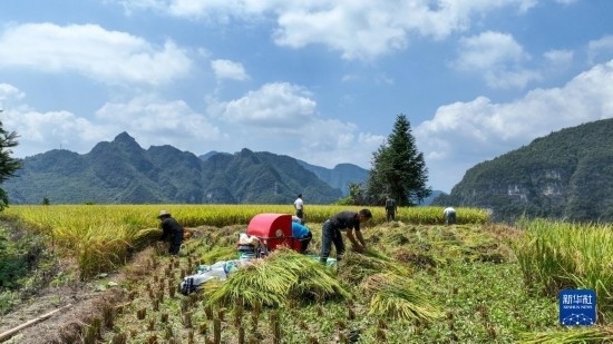 9月15日,村民在貴州省黔西市錦星鎮(zhèn)洪湖村收割稻谷。