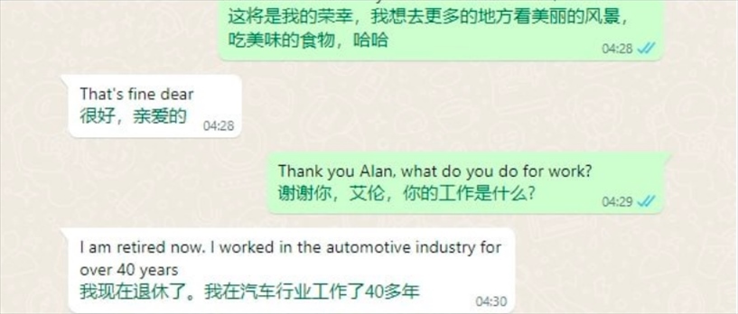 這個(gè)過(guò)程被他們稱為“切客”。張先生說(shuō),他們一般會(huì)通過(guò)分享新聞將對(duì)話引導(dǎo)到經(jīng)濟(jì)狀況的話題,然后進(jìn)一步觀察對(duì)方有沒(méi)有投資的興趣?!叭绻磻?yīng)很好的話,就直接引導(dǎo)他去投資,如果不好就繼續(xù)聊感情。”